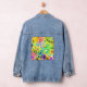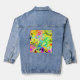 This denim jacket sports a portion of a larger design. It has the popping shades of summer including: yellow, lime green, pink, orange, turquoise, aqua, black, coral, blue and more. I used layers upon layers of colours and textures in varying degree of opacities to give these depth and most importantly...FUN!