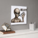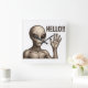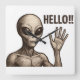 A grainy monochrome alien waves hello in a retro sci-fi style with bold “HELLO!!” text.