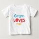 Gram Loves Me T-shirts, cards, stickers, bodysuits bags, and more with colourful red, yellow, and blue text and heart design. These Gram Loves me apparel and gift items will make gram smile!