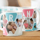 Honeycomb coffee mug, personalised with 5 of your favourite photos and printed with a 4 letter name, such as GRAN. The design features a honeycomb photo collage in a pretty colour palette of summer blue pink and alabaster, with a cute little bee. If you want to change the colours, click "customise further" and click each hexagon that you want to change.