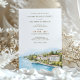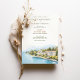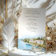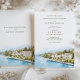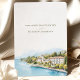 This sophisticated destination wedding invitation features a stunning watercolor illustration of the Grand Hotel Fasano on the shores of Lake Garda, Italy. The artwork captures the serene beauty of the lake, lush greenery, and elegant European architecture, all in soft, natural tones. The typography combines classic serif and modern script fonts, giving the invitation a refined and timeless aesthetic. Perfect for couples planning a romantic wedding in Italy, this invitation sets the tone for an unforgettable celebration.