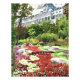 The Secret Garden at Grand Hotel on Mackinac Island in Northern Michigan post card. Beautiful secret garden filled with colourful flowers hidden in sun dappled woods on the grounds on the historic Grand Hotel on Mackinac Island, Michigan.