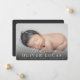 An elegant birth announcement design featuring a full bleed horizontal or landscape orientated photo with "introducing [name]" along the bottom in chic calligraphy script and classic serif lettering. Your baby's birth stats and your family signature appear beneath. Add three additional square photos to the back.
