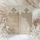 This wedding invitation is a tribute to exquisite Islamic architecture, featuring a magnificent arch as a symbolic entrance to a joyful union. The design is a splendid tapestry of cream and taupe hues, accented with the elegance of an alabaster calligraphy emblem at the pinnacle of the arch. Chevron columns in subtle shades of oat and khaki frame the architectural marvel, while a background of wheat and beige provides a canvas that speaks of timeless class. The swirling arabesque and floral patterns in ivory and flecks of gold leaf celebrate a rich heritage, making this invitation a portal to the couple's new beginning in a style that honours the past and embraces the future.