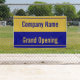 A grand opening banner lets everyone know your business has opened its doors to the public. The faux gold text at the bottom says 'Grand Opening'. The gold text is on a navy blue stripe. A faux gold stripe at the top has navy blue display text for the company name.