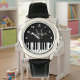 Custom name monogram black and white grand piano keys kids watch. Cute Birthday or Holiday gift idea for boy or girl. Unique personalised presents for piano player, pianist, piano teacher, instructor, musician, music lessons, students, children etc. Elegant black and white monogrammed wristwatch design with classical instrument keyboard design. Personalise this timepiece with your child's name. Stylish script typography. Available in different colours.