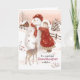On this vintage style Christmas card for Granddaughter, I've painted a sweet little girl tying a red scarf around the neck of a large snowman. A cute baby deer looks on. The girl is wearing a long dress under a heavy red coat with a white fur effect trimming on the sleeves and hood. In the background of this snow scene is a little cabin and trees