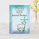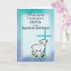 Customise this card with your granddaughter's name as you send her special blessings on her Baptism Birthday! A sweet lamb is standing in front of a teal coloured cross. Purple and lavender background fades into the teal and green in a watercolor look.