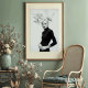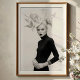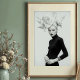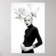 Make a striking statement with this captivating black and white art print, a true masterpiece of avant-garde fashion and artistic expression. This compelling frontal portrait features a woman of stunning poise, crowned with an extraordinary, voluminous white headpiece that resembles an abstract, grand bloom or cascading petals. Dressed in a sleek black turtleneck gown, her long white gloves and intricate silver bracelets create a striking contrast against her dark attire, while a ornate brooch at her neck adds a touch of refined detail. Her pale skin, bold dark lips, and piercing gaze create a mesmerising visual impact against the pristine white background, emphasizing the dramatic interplay of light and shadow. This artwork embodies a confident, mysterious, and ultimately breathtaking elegance. Perfect for modern living spaces, fashion studios, or any decor seeking a touch of unique sophistication, bold artistry, and a truly unforgettable visual narrative.