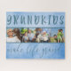 This jigsaw puzzle is a fun photo gift for Grandparents. You can add 4 of your favorite photos of the grandchildren, which are displayed in square format, photo strip style. The simple collage is framed with the saying "grandkids make life grand" and is set against a blue background. Please browse our store for more gifts for grandparents.