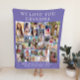 A custom purple photo collage keepsake blanket for that perfect grandma gift featuring 30 photos of her grandchildren, family, pets, etc., one or two lines of text, such as "we love you grandma," and your names in elegant white typography.