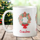 This pretty mug is printed with a decorative watercolor of a festive wreath of Christmas gingerbread cookies.