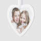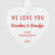 Cute Christmas ornament gift for Grandma and Grandpa. On the front, your picture fills a heart-shaped frame. On the reverse, you can personalise the expression to "I Love You" or "We Love You," and personalise whether they are called "Grandma & Grandpa," "Nana & Papa," "Mommom & Poppop," etc. You can also add the grandchild's or grandchildren's names and year, all in red typography against a white background.