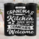 This delightful graphic celebrates family warmth with the inviting phrase "GRANDMA'S Kitchen MADE WITH LOVE GRANDKIDS Welcome" in crisp white lettering against a black background. Charming kitchen icons, including a rolling pin, whisk, spatula, and knife, are playfully integrated. Hearts signify affection, creating a heartwarming design for a cherished grandma's cooking space.
