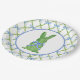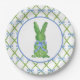 This topiary plate design features a very chic blue and green lattice patterned background with a coordinating bunny shaped topiary with a coordinating blue bow.