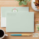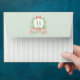 This Christmas envelope has a preppy grandmillennial design featuring a Christmas wreath with a monogram letter on the back flap. The back and the inside have a light green scalloped stripe pattern.