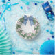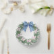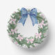 This Christmas party plate has a Christmas wreath with a pink and blue bows.
