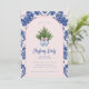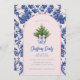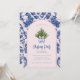 This Christmas party invitation has a preppy grandmillennial design featuring a Christmas Tree in a blue and white Chinoiserie pot crest with a blue and blush pink arched border around the edge. The front and back have a coordinating damask pattern.