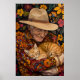The illustration features an elderly man wearing a stylish Borsalino hat and a vibrant floral shirt. He gently cradles a red cat in his arms, exuding warmth and affection. His serene expression suggests a calm and peaceful moment between the man and his feline companion.