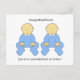 Two twin baby boys in identical blue outfits and the words 'Congratulations you're a Grandparent to twin boys!'