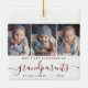 Help them commemorate their grandchild's first Christmas with this beautiful modern keepsake ornament. The grey text reads "Our first Christmas as grandparents," with the word "grandparents" in elegant burgundy red handwriting script with flourishes before and after. Replace the three sample images with your favourite vertical photos, and add baby's name and the year.