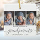 Help them commemorate their grandchild's first Christmas with this beautiful modern keepsake ornament. The grey text reads "Our first Christmas as grandparents," with the word "grandparents" in elegant handwriting script with flourishes before and after. Replace the three sample images with your favourite vertical photos, and add baby's name and the year.