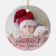 Help them celebrate their first grandchild with this beautiful modern keepsake ornament. The off-black text reads "Our first Christmas as grandparents," with the word "grandparents" in elegant handwriting script with flourishes before and after. Easily replace the sample image with your favorite photo of the new baby, and add his or her name and the year. A white gradient filter helps make the text pop.