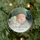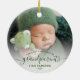 Help them celebrate their first grandchild with this beautiful modern keepsake ornament. The green text reads "Our first Christmas as grandparents," with the word "grandparents" in elegant handwriting script with flourishes before and after. Easily replace the sample image with your favourite photo of the new baby, and add his or her name and the year. A white gradient filter helps make the text pop.