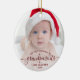 Help them celebrate their first grandchild with this beautiful modern keepsake ornament. The burgundy red text reads "Our first Christmas as grandparents," with the word "grandparents" in elegant handwriting script with flourishes before and after. Easily replace the sample image with your favourite photo of the new baby, and add his or her name and the year. A white gradient filter helps make the text pop.