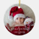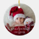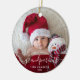 Help them celebrate their first grandchild with this beautiful modern keepsake ornament. The white text reads "Our first Christmas as grandparents," with the word "grandparents" in elegant handwriting script with flourishes before and after. Easily replace the sample image with your favourite photo of the new baby, and add his or her name and the year. A dark gradient filter helps make the text pop.