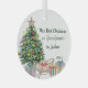 Our First Christmas as Grandparents to ... personalised holiday ornament keepsake. The design features a lit christmas tree with crib and gift wrapped presents. Perfect keepsake gift for grandparents celebrating the first christmas with a first, or new grandchild.