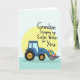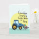 Designed with a sturdy, stylized azure utility vehicle at the center, the scene feels like a small gesture of care delivered with steady determination 🐰. Behind it sits a soft, sun-like yellow circle that frames the vehicle and gives the whole layout a gentle glow. In the front scoop, a clustered pile of decorated egg shapes shows stripes, dots, and small pattern accents in mixed cheerful colors, as if someone took time to make each one a little different for you 🌷. The background shifts through cool blue and green tones, keeping the focus on the warm yellow circle and the bright cargo. Above the illustration, the message “Grandson Scooping up Easter Wishes for You” is placed in a flowing, hand-drawn style, set in a dark tone that stands out clearly against the lighter sky area. The vehicle’s forward-leaning stance and the careful way the scoop holds the eggs suggest a fond, thoughtful connection, like a family member bringing a sweet surprise. Simple outlines and flat color fills give it a modern look while still feeling friendly and approachable. Small details like the vehicle’s dark wheels, the curved scoop edge, and the patterned eggs sit crisply against the soft yellow circle.