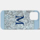 This Monogram design, features a square, blue frame, surrounding a blended, pattern of colours, in blue, light-blue, yellow, white, grey, and black-simulating, granite marble.
