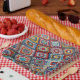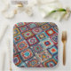 Multicolored crochet granny squares are arranged in a grid each featuring a unique pattern of concentric shapes