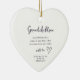 Celebrate the joy of family with our personalised ceramic ornament, featuring a beautiful heartfelt quote. This charming ornament captures the essence of love and connection, making it a perfect addition to your holiday decor or a thoughtful gift for cherished grandparents. Easily customise and make it 100% your own. This design features a pretty hand drawn heart and includes a gold ribbon. The design is minimalist, fresh clean and white. This simplistic stationery, is modern elegant and classy, with a chic yet traditional touch. This design is also available for other events. Create a coordinating theme for your memorable day with our matching stationery and décor, all available for an additional low cost. All my invitations and stationery are designed with love, customised 100% satisfaction guarantee!