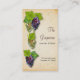 A grapevine with four clusters of wine grapes align along the left side of this business card. The grapevine snakes behind the grapes against a parchment background. A great card for a wine bar, wine shop, vineyard or a vintner. Available with matching products.