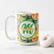 A watercolor ai illustration pattern of lemons, limes, oranges and grapefruits. Juicy citrus in coral, yellow and lime green personalised coffee mug.