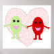 A poster featuring a cute cartoon of a smiling red grape holding hands with a smiling green grape with a pretty pink heart in the background and a pink border, both grapes have shiny black eyes and pink mouths.