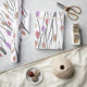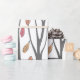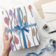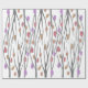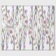 Thanksgiving or fall seasonal everyday tree and leaves graphic patterned wrap ideal for Thanksgiving, harvest time, winter or autumnal gifts. Wrapping paper in a grey brown with bright pink, purple, orange and pink leaves on a white background. Design by Sarah Trett.