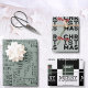 A graphic black and white graphic design themed wrapping paper. Merry christmas written in a viriaty of script and font style. With a contrast of black and white and details in red and green.