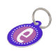 This round pet tag features a graphic lowercase letter E on a royal blue and lilac background, surrounded by a circle of white dots. Fully customisable! Add your dog's personal info on back, or delete if you prefer.