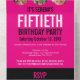 Bold simple graphic bright hot pink, black and white photo template all-in-one 50th birthday party invitation. Personalise this detachable milestone birthday invitation with your own birthday party event details, and up to six different photos of your birthday girl. Invite comes with a simple RSVP detachable reply card where you can also request a song to dance to or ask for any dietary or special requirements if required. Simple three photo circles for your now and then photos on both sides so there are up to six different photos you can add. Other colours and matching items are available. © Original design by Sarah Trett for www.mylittleeden.com on Zazzle.