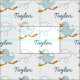 Fun running duckling bird art and name graphic fabric. Ideal for making a really special sewing creation for Easter. Cute pale light blue ducklings with teal name text. Personalise with your own name, currently reads Taylor. Uniquely Illustrated and designed by Sarah Trett.