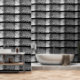 A serene bedroom where quiet breathes. The graphic wall pulses softly, a secret rhythm watching over rest.