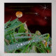 Art poster, a digital photo collage featuring the quote by Walt Whitman, "I believe a leaf of grass is no less than the journey-work of the stars". Poster features grass with dewdrops and a red sky background with moon and stars.
