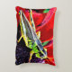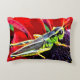 This decorative accent pillow features a shiny green, yellow and black grasshopper perched on the purple centre of a flower with gorgeous red petals.