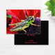 This brilliantly coloured Artist Trading Card features a shiny green, yellow and black grasshopper perched on the purple centre of a flower with gorgeous red petals.