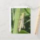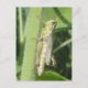 This postcard features a close up of green grasshopper on a sunflower stalk.