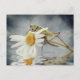 Closeup of grasshopper on daisy flower, seen of profile, above water on cloudy blue sky background, digital effect