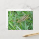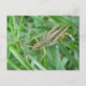 This postcard features a detailed macro photograph of a small green grasshopper with brown mottled markings sitting on the grass. In the photograph you can see the detail of the jointed legs, long antennae and black and gold eyes of the grasshopper.